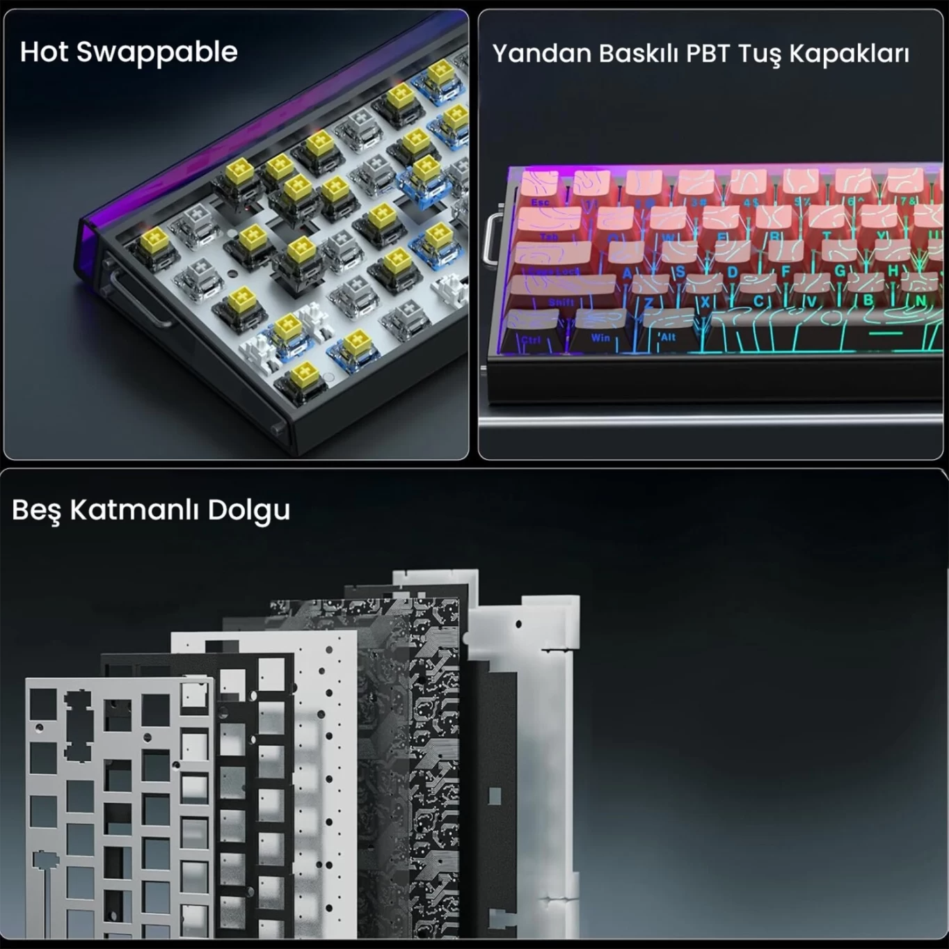 - %65 TKL premium tasarım: Kompakt yapı, sessiz çalışma ve Cherry profil PBT tuşlarla konfor.