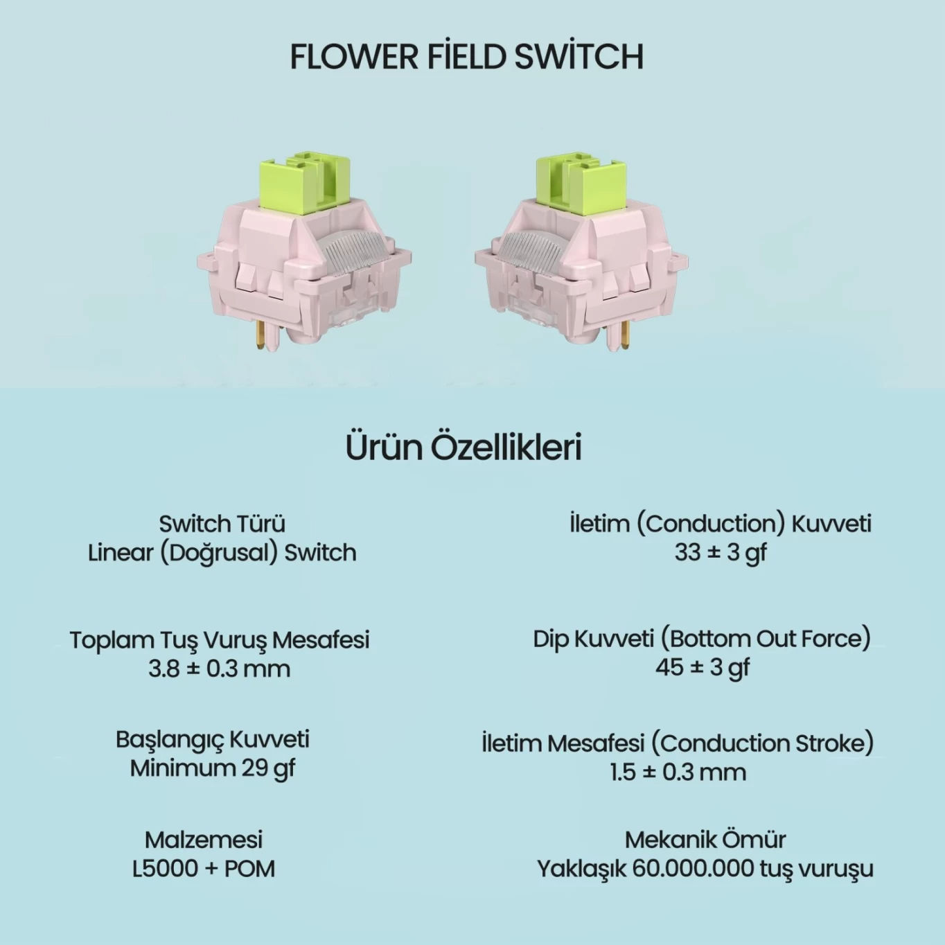 Flower Field (Huatian) Switch, teknik açıdan da kullanıcıyı memnun edecek bir performans sunar. Toplam 3.8 ± 0.3 mm tuş mesafesi ve 1.5 ± 0.3 mm iletim noktası ile hızlı tepki verirken, yaklaşık 60 milyon tuş vuruşu ömrüyle uzun süreli kullanım için güven verir. Hem hassasiyet hem de sağlamlık isteyenler için oldukça dengeli bir tercihtir.