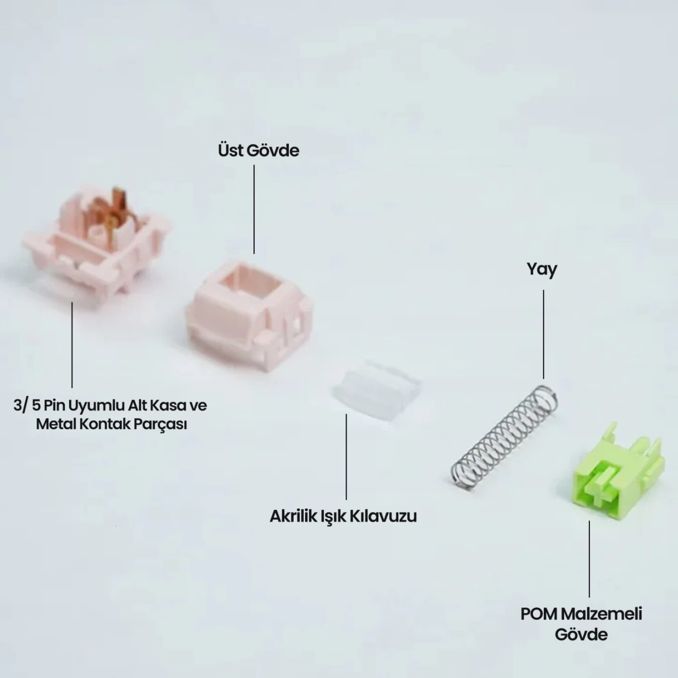 Switch’in yapısında kullanılan L5000 + POM malzeme birleşimi, yüksek düzeyde sürtünme direnci ve dayanıklılık sağlar. Bu yapı, her bir tuş vuruşunun sessiz, kaygan ve istikrarlı bir biçimde gerçekleşmesine katkıda bulunur. Sürtünme oranının düşük olması, yazım hissini ipeksi ve akıcı hale getirir.